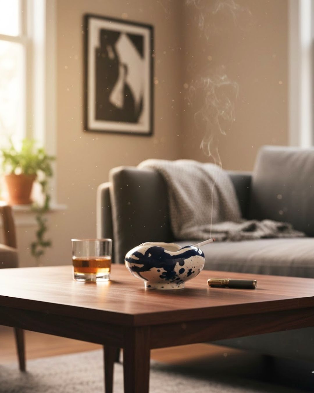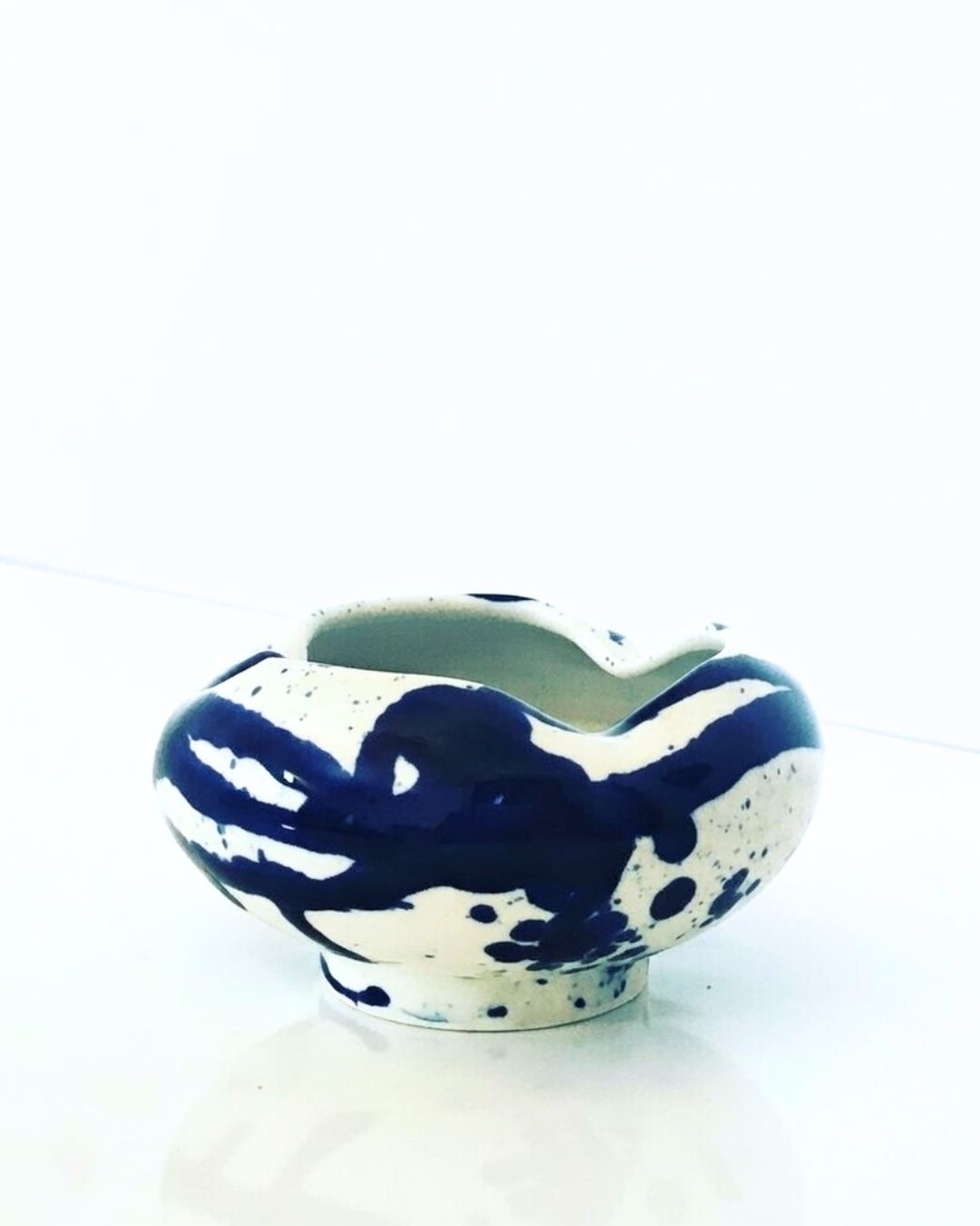 Apportez une élégance brute à votre espace avec ce cendrier en céramique fait main. Arborant un décor de projections bleu profond sur un émail blanc brillant, sa forme organique et ses encoches discrètes en font un objet de décoration à part entière, idéal pour un salon moderne ou une terrasse raffinée.
