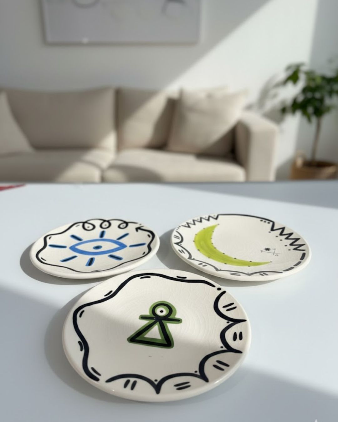 Élevez votre décoration murale avec ce lot de trois petites assiettes décoratives au design poétique et singulier. Entre art primitif et minimalisme contemporain, ce trio transforme n’importe quel espace en une galerie privée. Chaque pièce raconte une histoire à travers des symboles universels revisités.