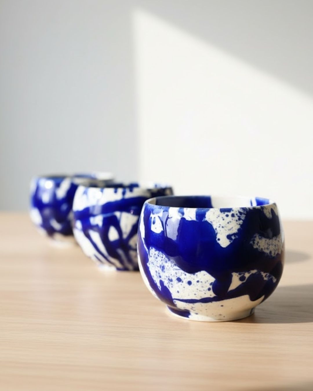 L’Art de la Table à l’état pur. Le trio « Éclats d’Azur » célèbre l’imprévisibilité et la beauté du geste artisanal. Chaque bol est une pièce d’exception, habillée de nuances bleues intenses qui semblent couler et se projeter sur la céramique blanche, créant un contraste visuel saisissant et moderne.